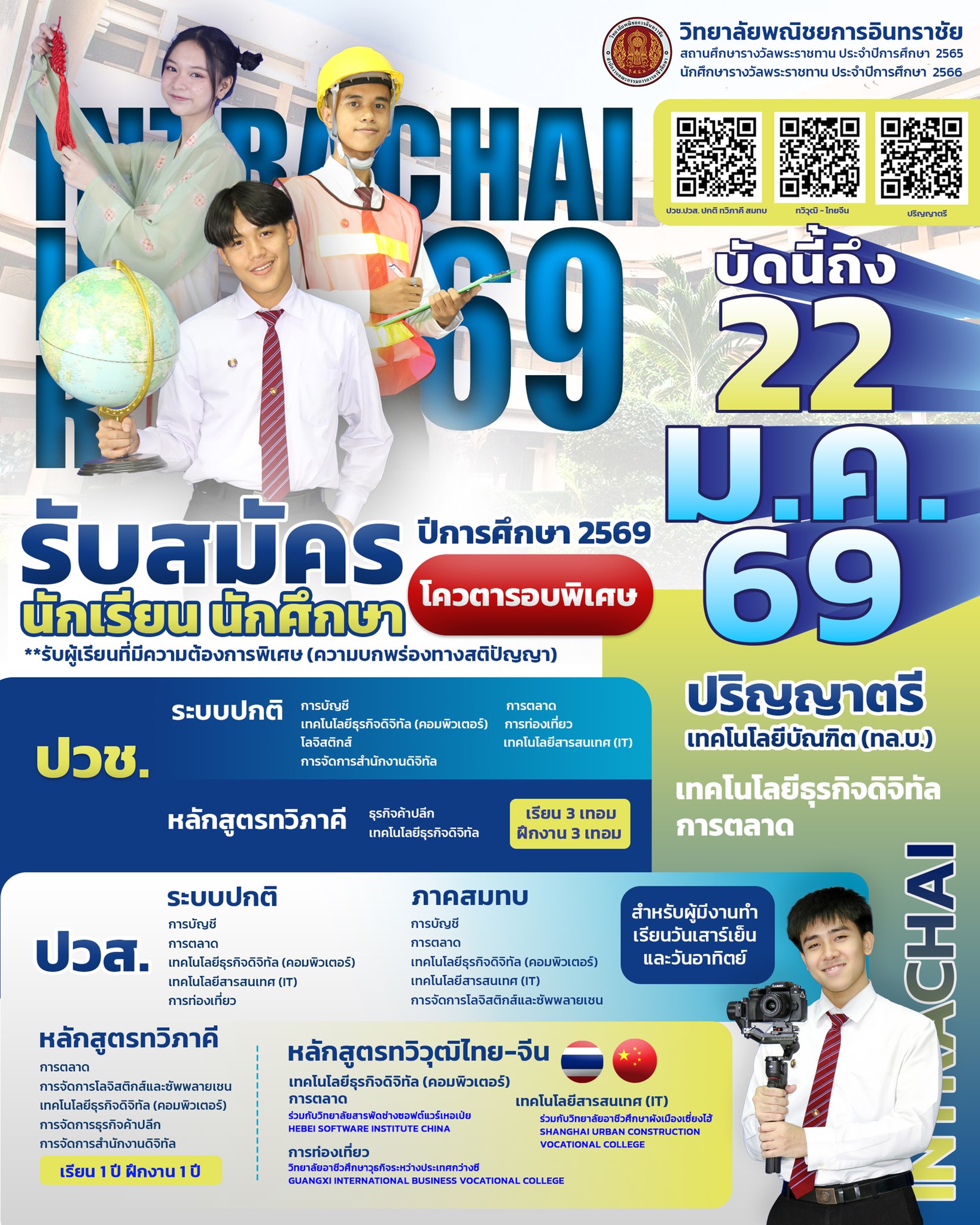 ประกาศวิทยาลัยพณิชยการอินทราชัยเรื่อง การรับสมัครสอบคัดเลือกบุคคลเพื่อเป็นลูกจ้างชั่วคราวรายเดือนตำแหน่ง เจ้าหน้าที่ธุรการ จำนวน 2 อัตรา ตั้งแต่วันที่18 - 25 เมษายน 2568 (ในวันราชการ)