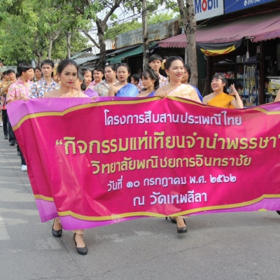 วันที่ 10 กรกฎาคม 2562 วิทยาลัยพณิชยการอินทราชัย จัดกิจกรรมโครงการสืบสานประเพณีไทย 'กิจกรรมแห่เทียนจำนำพรรษา' ณ วัดเทพลีลา พระอารามหลวง